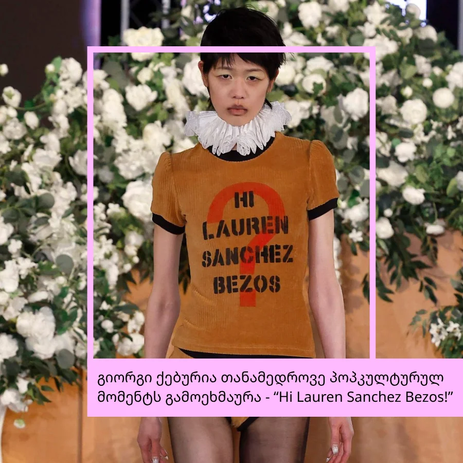 ასეთივე შემთხვევა ვიხილეთ წლევანდელ ლონდონის მოდის კვირეულზეც, რომელზე წარდგენილი კოლექციის ერთ-ერთი მაისურით გიორგი ქებურია თანამედროვე პოპკულტურულ მომენტს გამოეხმაურა - “Hi Lauren Sanchez Bezos!”