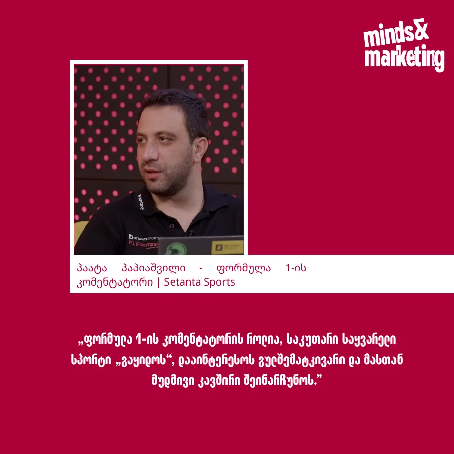 „ფორმულა 1-ის კომენტატორებს ამ შემთხვევაში პილოტებს შევადარებდი. მაგალითად, ლუის ჰამილტონი - რომელიც ტრასის გარეთაც ძალიან აქტიურია და დიდ გავლენას ახდენს სპორტის პოპულარიზაციაზე. ზუსტად ასე უნდა იყოს კომენტატორიც - მხოლოდ გახმოვანებით არ უნდა შემოიფარგლოს. მისი როლია, საკუთარი საყვარელი სპორტი „გაყიდოს“, დააინტერესოს გულშემატკივარი და მასთან მუდმივი კავშირი შეინარჩუნოს.