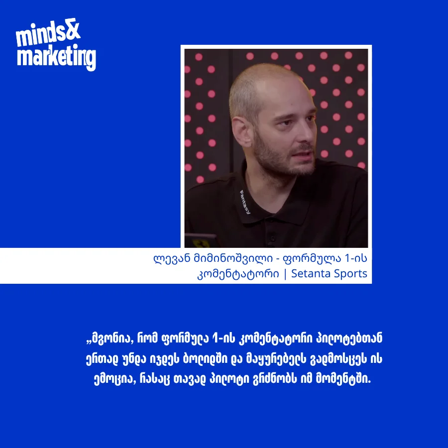ვფიქრობ, კარგი კომენტატორი სწორედ ამ ყველაფრის ერთობლიობაა - მისი სამუშაო არ უნდა მთავრდებოდეს რბოლის დასრულებით. პირიქით, ამის შემდეგაც უნდა აგრძელებდეს აქტიურ კომუნიკაციასა და გულშემატკივართან ურთიერთობას.’’